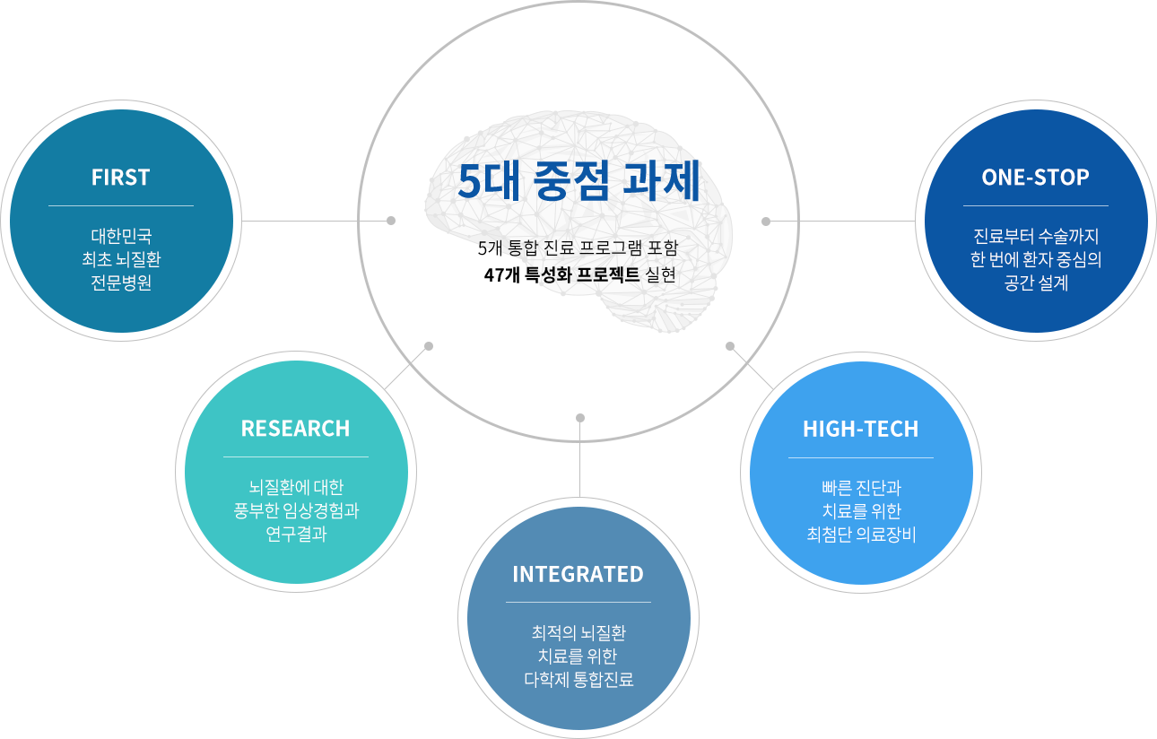 이와 함께 고령화 사회로 접어들며 뇌졸중, 파킨슨병, 알츠하이머병 등 치매, 간질, 우울증, 정신분열증, 신경성 통증 등 각종 뇌 관련 신경 및 정신질환으로 고통 받는 사람들이 급증하고 있는 것과 관련해 이들 질환에 대한 전문치료를 통해 뇌병원만의 특화 치료 패러다임을 구축하고 있습니다.