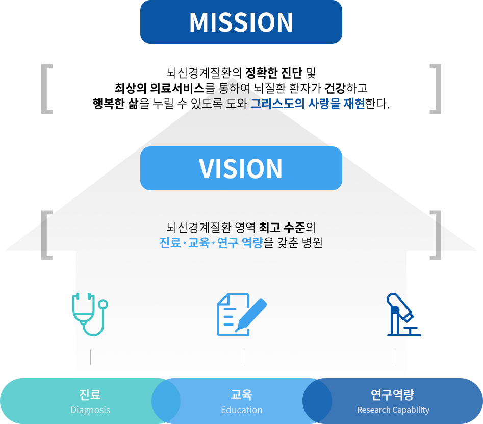 뇌질환은 적절하고 빠른 초기 대처와 치료가 향후 치료 성과에 커다란 영향을 미치는 만큼 모든 의료진이 치료 및 예방에 있어서 최상의 의료서비스를 제공하고자 합니다. 인천성모병원 뇌병원은 그 동안 고객 분들이 보내주신 사랑에 부응할 수 있도록 뇌질환에 대한 세계최고의 의료기술과 치료 성과, 환자중심의 병원문화를 선보일 것입니다.