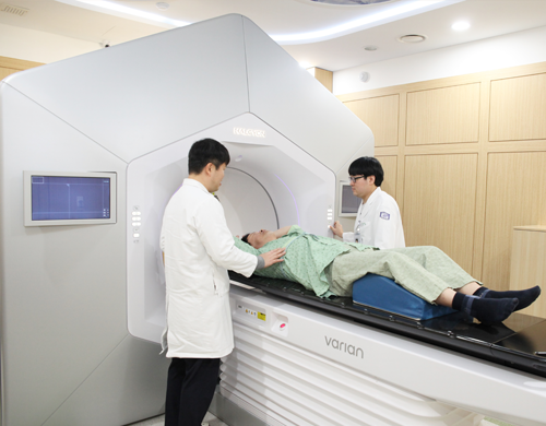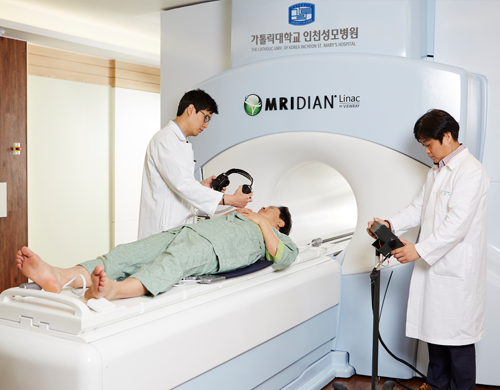 치료전에 MRI를 촬영하여 종양을 더욱 정확하게 조준해 방사선 치료를 시행할 수 있고, 방사선 치료를 하는 중에도 연속적으로 MRI를 촬영할수 있으므로 실시간으로 표적종양의 위치 및 변화를 확인하면서 치료할수 있는 세계최초의 MRI 유도 방사선 치료용 선형가속기입니다.